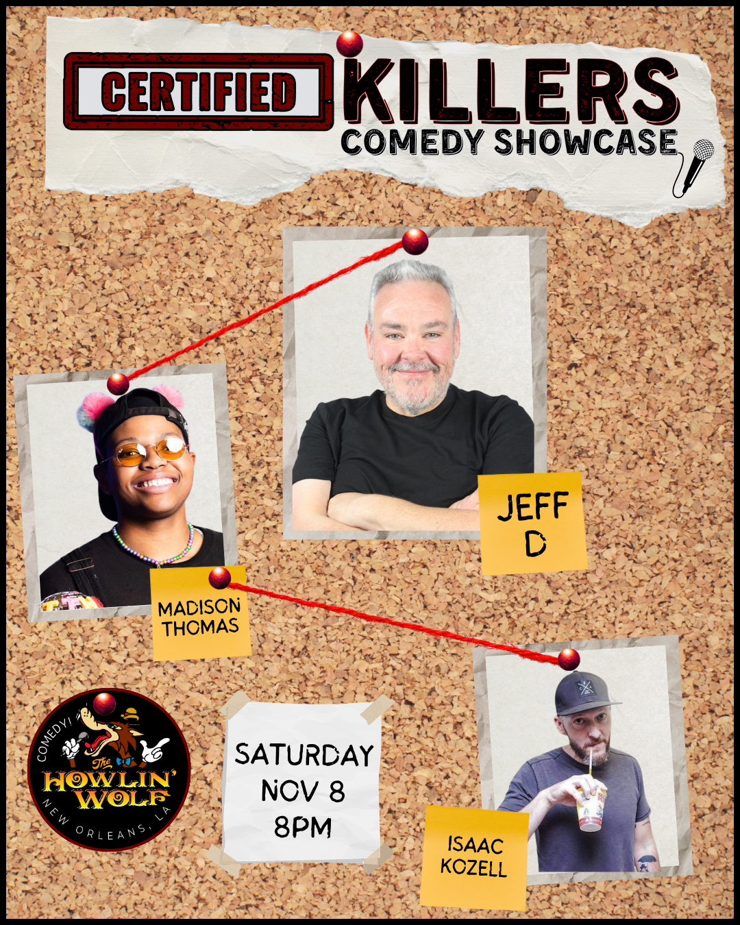 Join us at The Howlin' Wolf Saturday November 8 for Certified Killers, a new comedy showcase featuring hand picked killer comics guaranteed to make you laugh!
